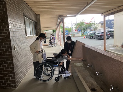 年生は、車いすやタオルで目を隠して歩く体験をしました。このような体験をとおして、子どもたちは