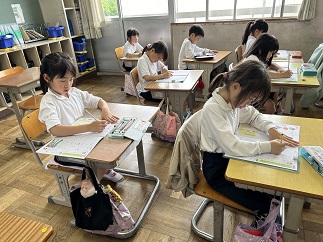 4連休明けの授業風景です、1年生の体育、まずはろくぼくのにぎり方から学習しました。2年生の書写、みんな自分の字に集中して丁寧に書いていました。3年生の音楽、よい姿勢で吹くとリコーダーの音もきれいです。友だちの音をよく聞きながら吹いていました。子どもたちの学びは進んでいきます。