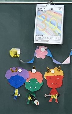 6年生の教室で、とてもかわいい節分の掲示を発見!子どもの手作りです。