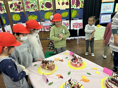 のむら幼稚園の作品展を、1年生の子どもたちが見に行きました。「おいしそうなケーキだなあ」「じょうずなお皿だね。私もつくりたいなあ」と感想を言いながらしっかり見ていた1年生!力作ぞろいの素敵な作品展です。