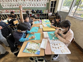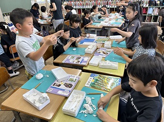 3年生の図工。かきべらや糸などの用具を使って、だれも見たことのないものを想像してつくっていました。何ができるのかな。