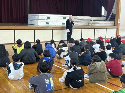 校区の保育園、幼稚園の来年新1年生になるお子さん、榊原小学校の1・2年生のみなさんをお招きして、体育館で「なかよし集会」を行いました。昨年度から津市のすべての小学校区で、幼稚園・保育園と小学校の接続に重点を置いた「津市架け橋プログラム」の取組を行なっています。1年生の子どもたちが司会をし、保育園・幼稚園の先生から手遊びを教えていただいたり、全員で「しろくまジェンカ」「貨物列車」をしたりして交流を深めました。最後に、1年生の子どもたちから、園児のみなさんにプレゼントを渡しました。