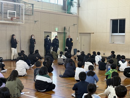 2月2日に、今年度4回目の避難訓練を行いました。今回は、5年B組の教室前廊下に不審者が侵入したという想定で行いました。今回の訓練には、津南警察署生活安全課・庄田駐在所・榊原駐在所の方に来ていただき、不審者が侵入したときに大切なことをお話していただきました。