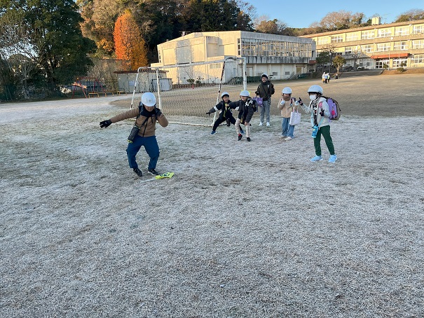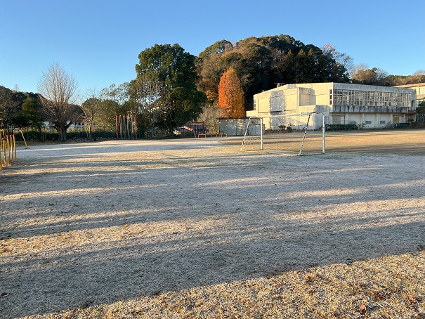 学校の運動場も… 霜で 真っ白です。