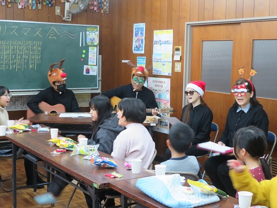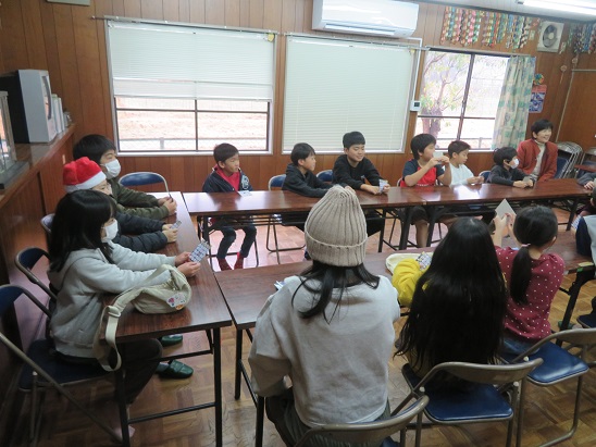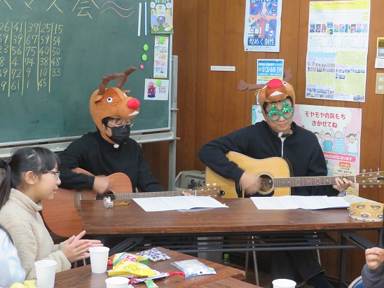 「赤鼻のトナカイ」「クリスマス・ソング」「なごり雪」「クリスマス・イブ」「あわてんぼうのサンタクロース」を ギターの演奏に合わせて 歌ったり、一緒に楽器を鳴らしたりしながら 楽しみました。