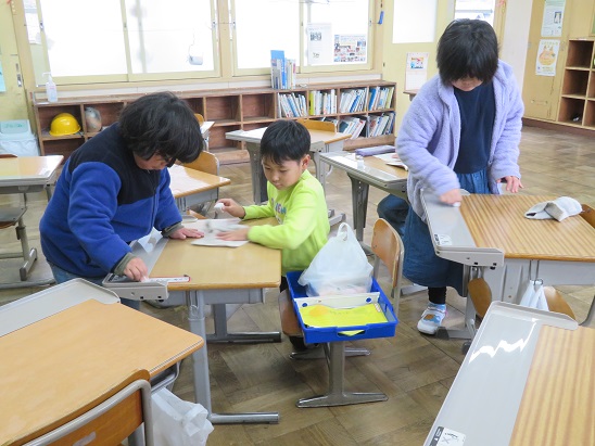 待っている間に、 自分の机を磨いている1・2年生。