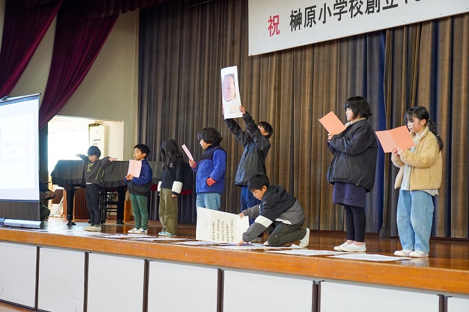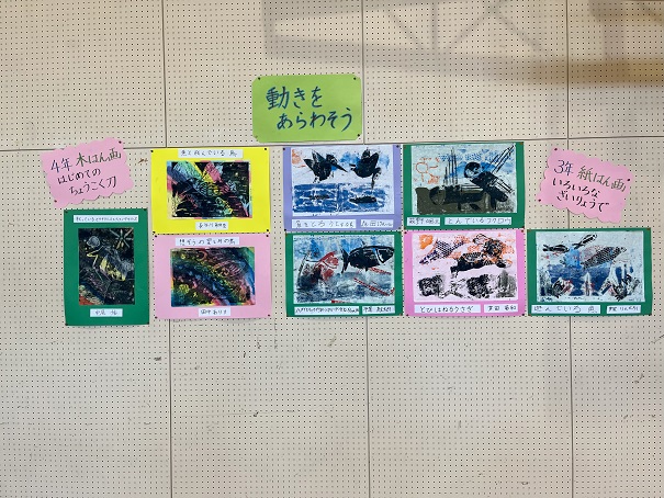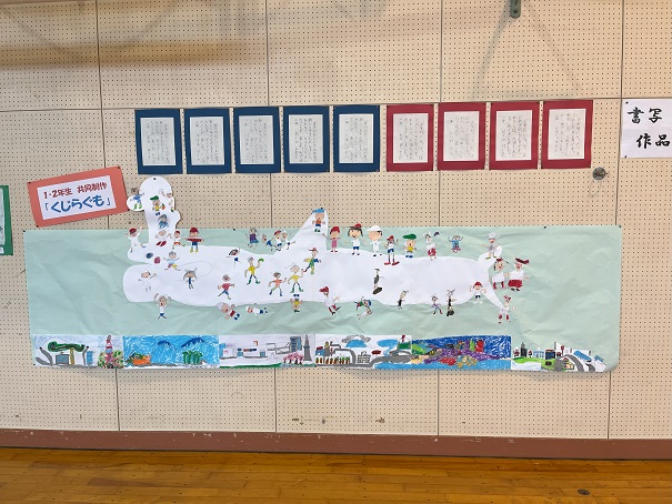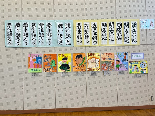 会場には、硬筆・書初めの作品や 5・6年生の人権ポスター、3・4年の版画作品、1・2年生の共同制作作品、児童会の提案「ありがとうの窓(校舎)」等が飾られていました。