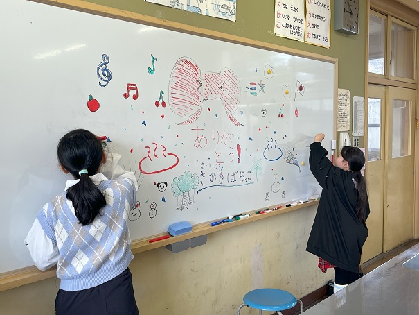 ホワイトボードも かわいく 飾ります。2人で 忙しく 準備を進めました。