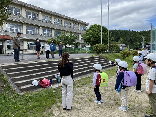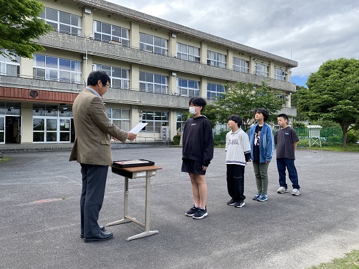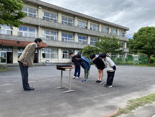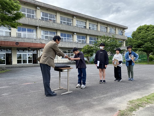 今日は 一斉下校の時に 今年度の田んぼアートの図案の表彰式がありました。