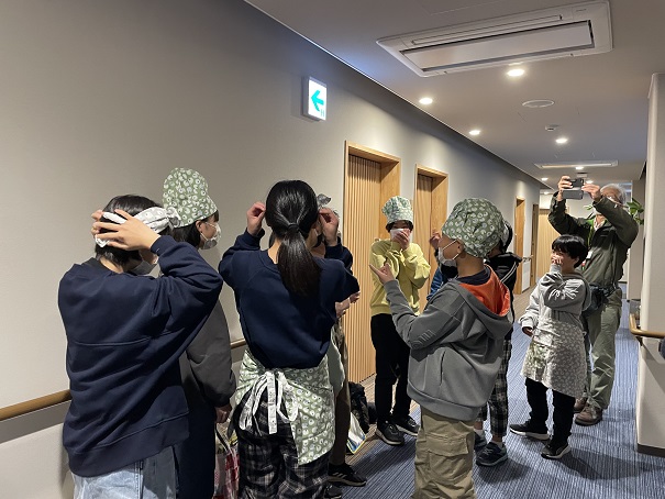 ヒツジの模様のバンダナや、帽子、エプロンを用意していただき、1人一つ選んで身に着けると、見習い職員に早変わり!