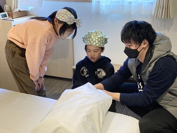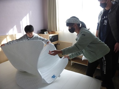 宿泊客室ベッドメイク。お客様が部屋に入られた時に「一番きれいに見えるように」
