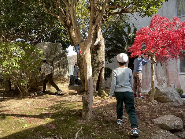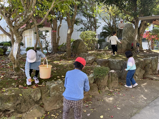 植え終わったら、色づいた葉っぱを集めて、秋の名残を感じていました。