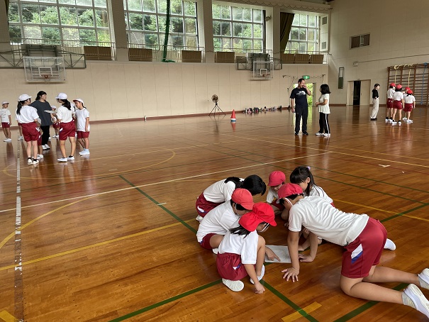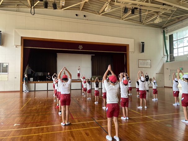 今日は、紅白縦割り班の並び方や、全校リレーの順番と走り方、ラジオ体操を練習しました。