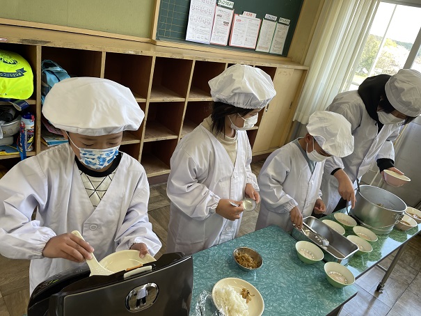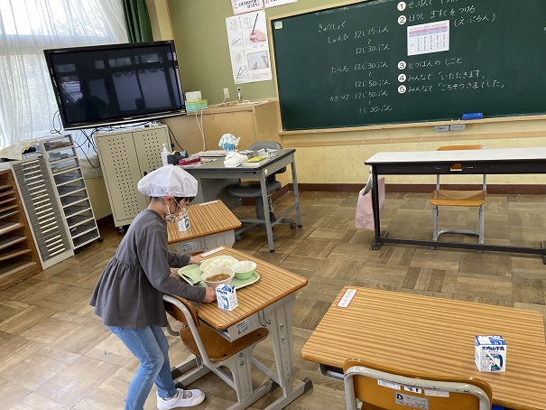 机ふきと牛乳係、盛り付け係、配膳係、みんなそれぞれの役割を果たします。