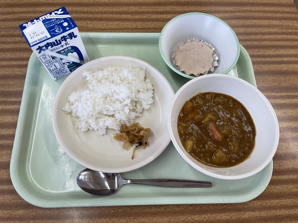今日の献立は、牛乳、米粉のチキンカレー、福神漬け、桜色蒸しパン