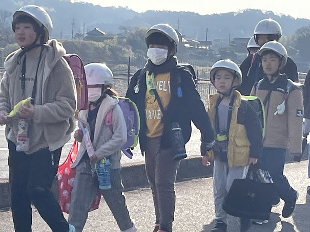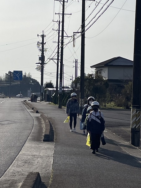6年生は、列の後ろで見守りながらの登校です。