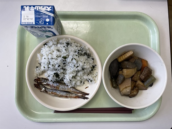わかめご飯、焼きシシャモ、春野菜の煮物、牛乳です。