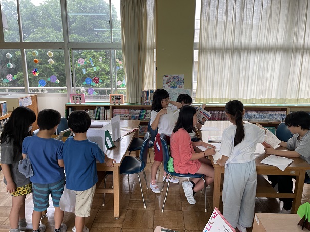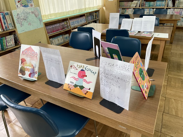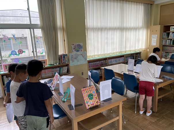 図書ボランティアさんと学校司書の先生が、模様替えをした図書室で