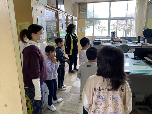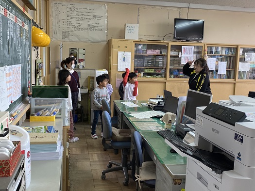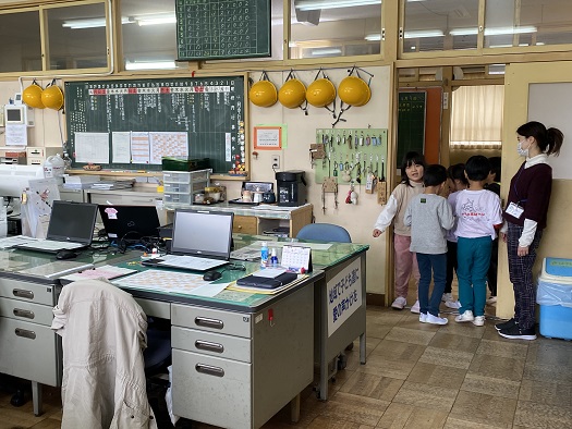 新1年生が学校探検で 職員室に来てくれました。