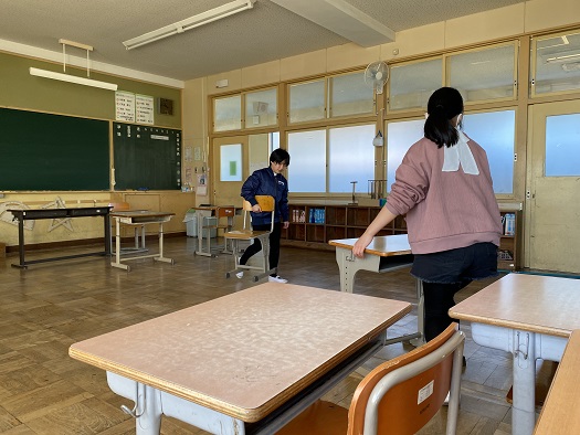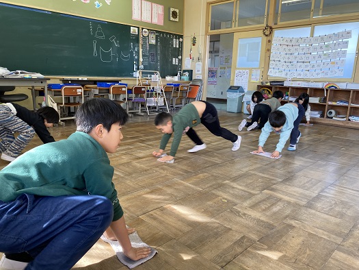 1・2年教室では ぞうきんリレーが始まっていました。