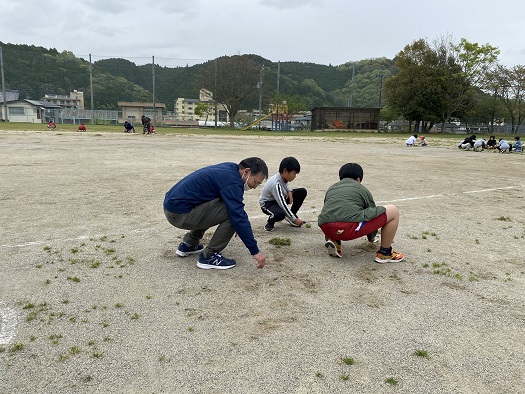 と言うことで 今日のそうじは 全員で運動場の草抜きです。
