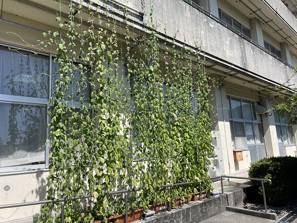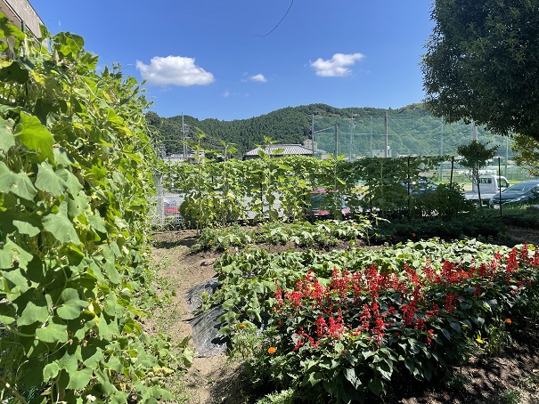 学級園のサツマイモ、ヒマワリ、ひょうたん、ホウセンカもすくすくと伸びています。