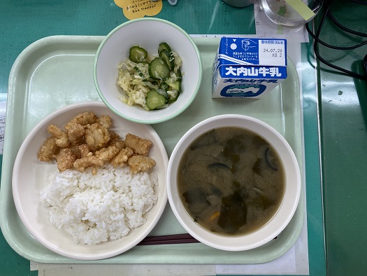 メニューは イカのかりん揚げ ぼん汁 きゅうりとキャベツの浅漬け