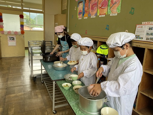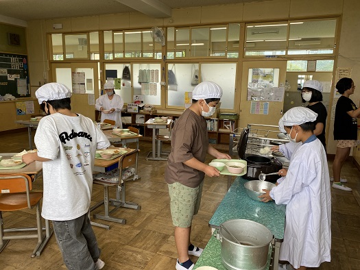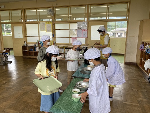 それぞれの教室では 給食の準備中でした。1年生も みんなで協力して