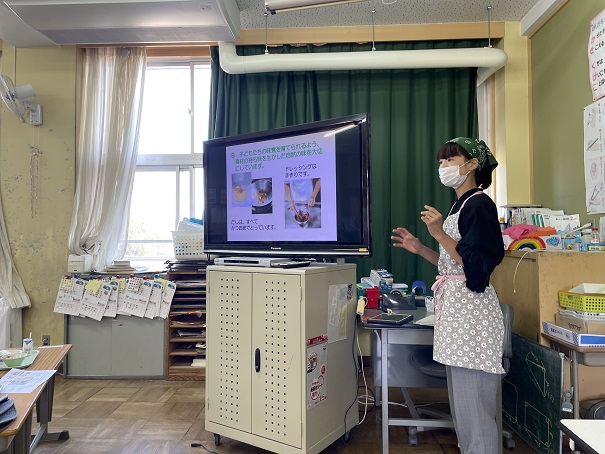 栄養教諭の片岡先生から、おいしい榊原米を炊飯器で炊いていること、地産地消の食材を使った献立や、食文化を伝える献立などについてお話がありました。
