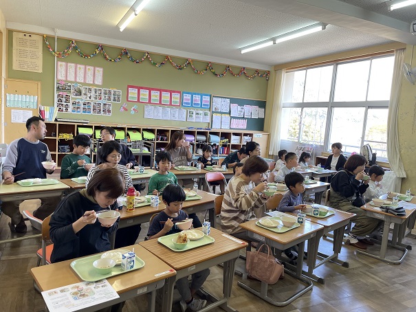 いのちの学習に続いて、1・2年生の保護者のみなさんが、給食の準備からごちそうさままで子どもたちといっしょです。