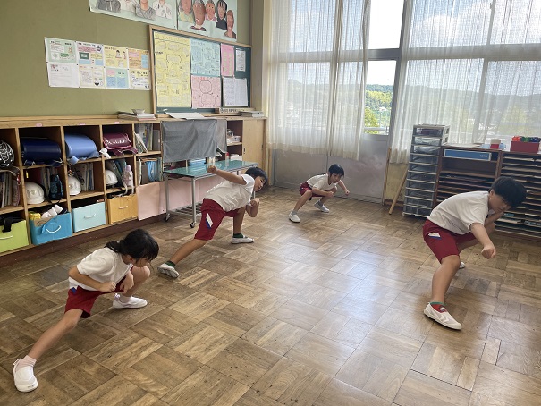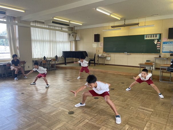 初めてソーランに挑戦している1年生に、やさしく6年生が教えていました。