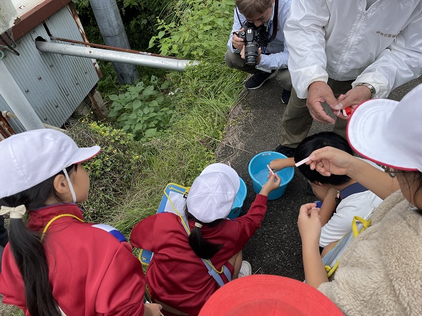 源泉2号のところでは、温泉水を飲んだり、リトマス試験紙を使ってアルカリ性を確かめたりしました。