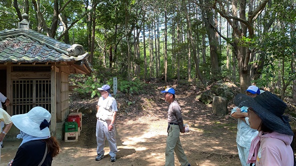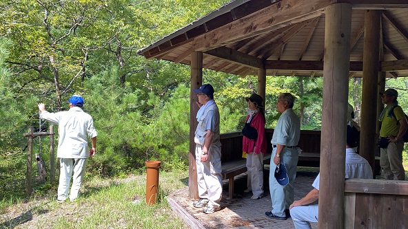 途中の東屋で一休み。「雄松」と「雌松」の見分け方を教えてもらっています。