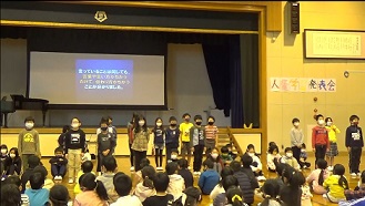 11月28日(土)の午前に、人権学習発表会を行いました。今年度は密を避けるため、低学年(1,2年生)、中学年(3,4年)、高学年(5,6年)の三部に分けての開催となりました。短い夏休みが明けた後、各学年で人権学習に取り組んできたことをもとに発表しました。