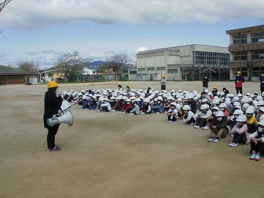 全校児童が避難を完了するのに、2分35秒かかりました。