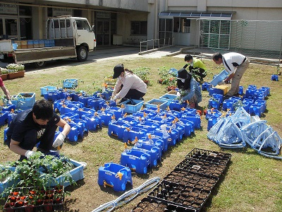 誠之小学校の先生で今日、2年生のトマトの苗を植えました。