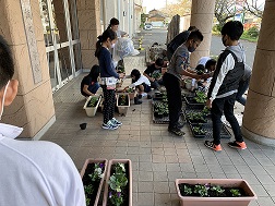 10月22日の昼休み、誠之地区社会福祉協議会さんからいただいた、たくさんの花の苗を栽培委員会の5年生・6年生がプランターに植えました。いただいた花をきれいに咲かせるよう、水やりを頑張ってほしいです。