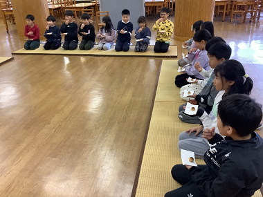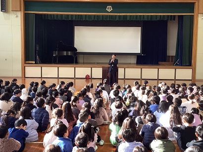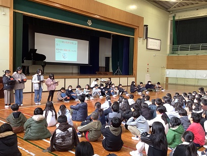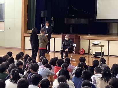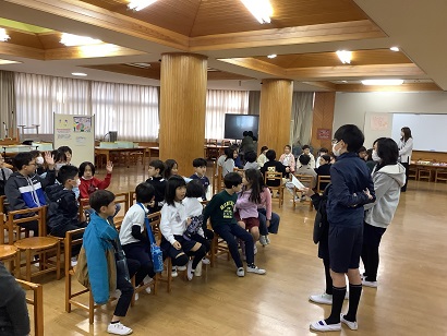 身体測定の時間には、いつも養護教諭が全学年で保健の授業をしています。今回のテーマは、「食べ物の旅」でした。食べ物が口から入って、うんちになって出てくるまでの過程を教えてもらいました。子どもたちは、食べ物の通り道(口・食道・胃・小腸・大腸)の長さがおよそ9mもあることや、食べ物を消化するのに24時間かかることなどを知りました。胃は、普段はこぶしくらいの大きさだけど、おなか一杯食べると約30倍の大きさになると聞いて、子どもたちはとても驚いていました。