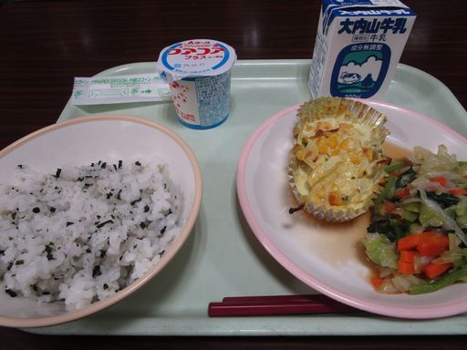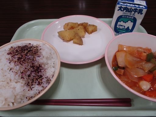 今日の献立は「あつあげとうずらたまごのあまずあん」「じゃがいものおかかまぶし」「しそとごまのふりかけ」「むぎめし」「ぎゅうにゅう」です。