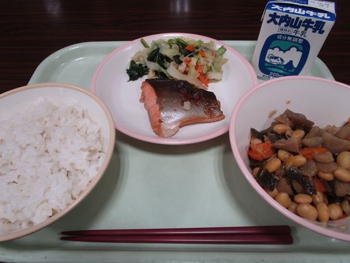 今日の献立は「さけのしょうがやき」「ごもくまめ」「さんしょくあえ」「むぎめし」「ぎゅうにゅう」です。