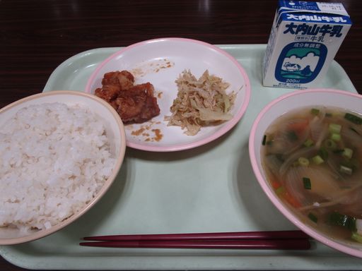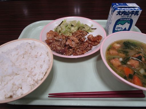 今日の献立は「とりごぼう」「しろみそしる」「ふうみづけ」「むぎめし」「ぎゅうにゅう」です。