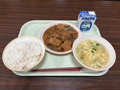 今日の献立は「あつあげのみそいため」「たまごスープ」「むぎめし」「ぎゅうにゅう」です。