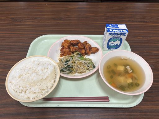 今日の献立は「ユーリンチー」「ワンタンスープ」「ちゅうかあえ」「むぎめし」「ぎゅうにゅう」です。