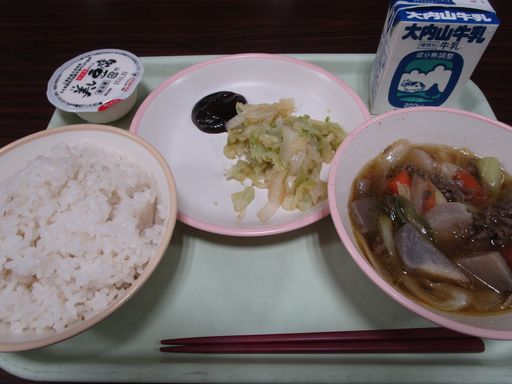 今日の献立は「とうふのみそかけ」「いもに」「むぎめし」「ぎゅうにゅう」です。