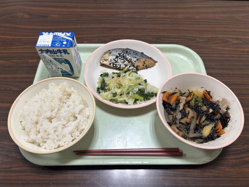 今日の献立は「さわらのなんぶやき」「ひじきとじゃがいものいために」「たくあんのあえもの」「むぎめし」「ぎゅうにゅう」です。