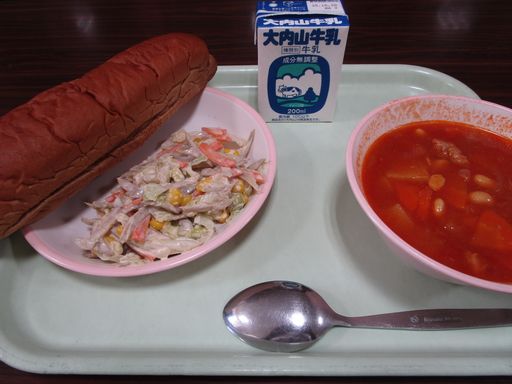 今日の献立は「ごぼうサラダ」「ポークビーンズ」「こくとうパン」「ぎゅうにゅう」です。