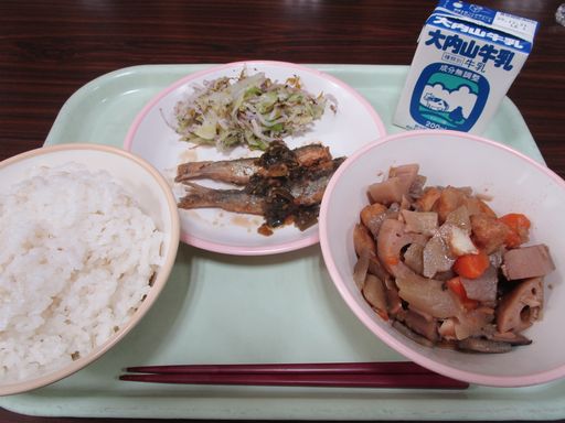 今日の献立は「いわしのなんばんづけ」「ちくぜんに」「むぎめし」「ぎゅうにゅう」です。