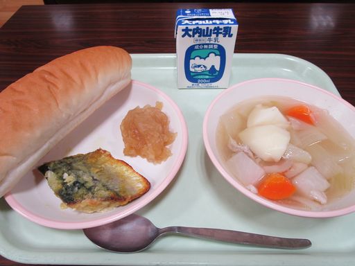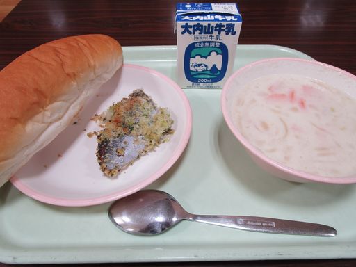 今日の献立は「さわらのハーブグリル」「じゃがいものミルタポタージュ」「パン」「ぎゅうにゅう」です。