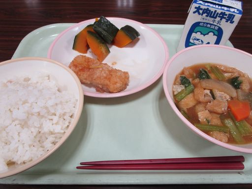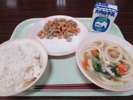 今日の献立は「とりなんばんうどん」「まめごぼう」「むぎめし」「ぎゅうにゅう」です。