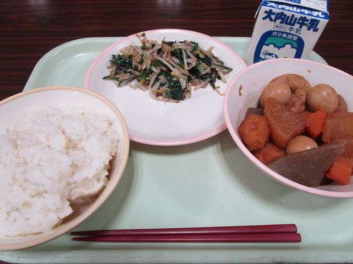 今日の献立は「みそおでん」「おかかあえ」「みかん」「むぎめし」「ぎゅうにゅう」です。